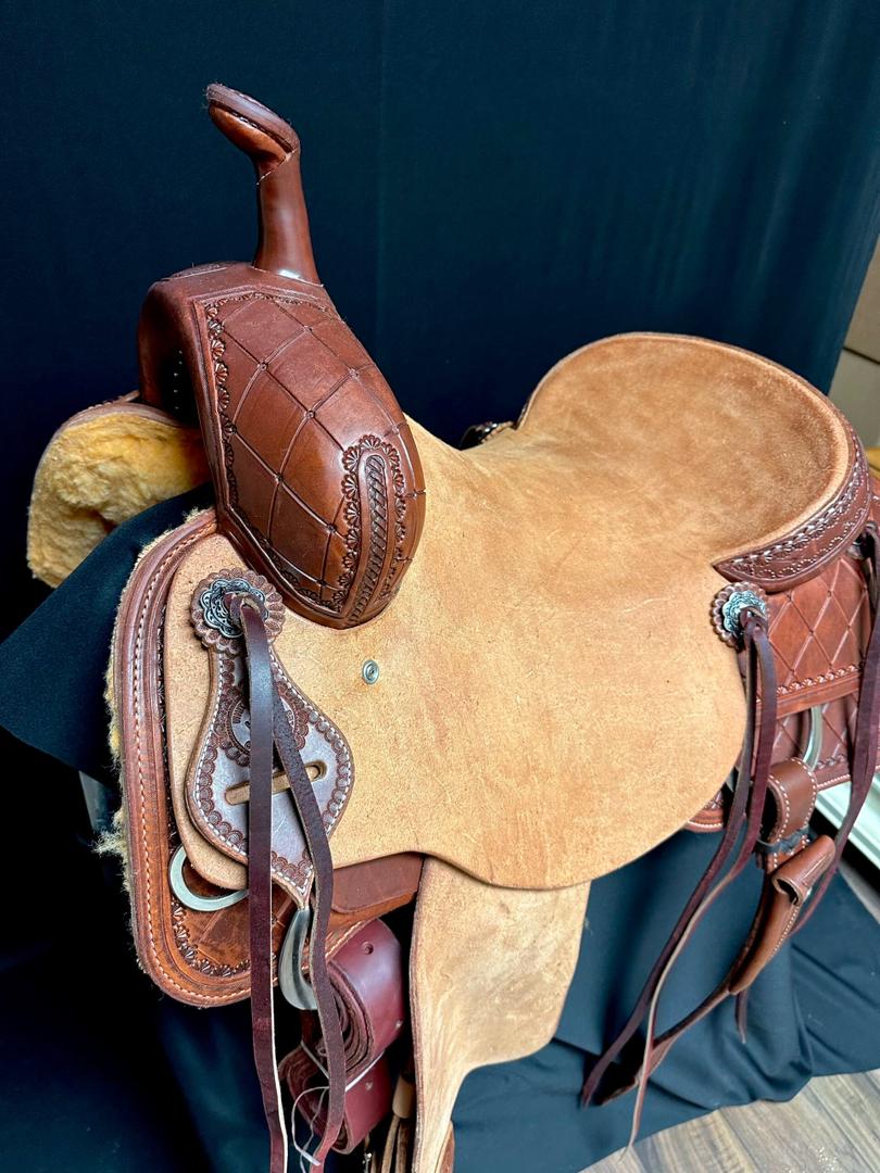 This White Rock Cutting Saddle is built on a Hadlock Brand, Buster Welch Tree, that carries a 5 year tree warranty, with Herman Oak leather, it comes standard with rawhide wrapped stirrups (pictured with Nettles stirrups $125 up-charge). It has a 9 inch front swell height, 13 inch width, 3 inch cantel and is a full quarter horse bar width. This saddle features a Diamond tooling pattern with roughout jockey and fenders. These saddles known as “cutters” are some of the most versatile in the industry and are used for Trails, Ranch, Team Sorting, Cutting and other disciplines as well. These trees fit a wide variety of horses from Quarter Horses to Draftcrosses to Gaited Horses. We have 16″ and 16.5″ in stock ready to ship!